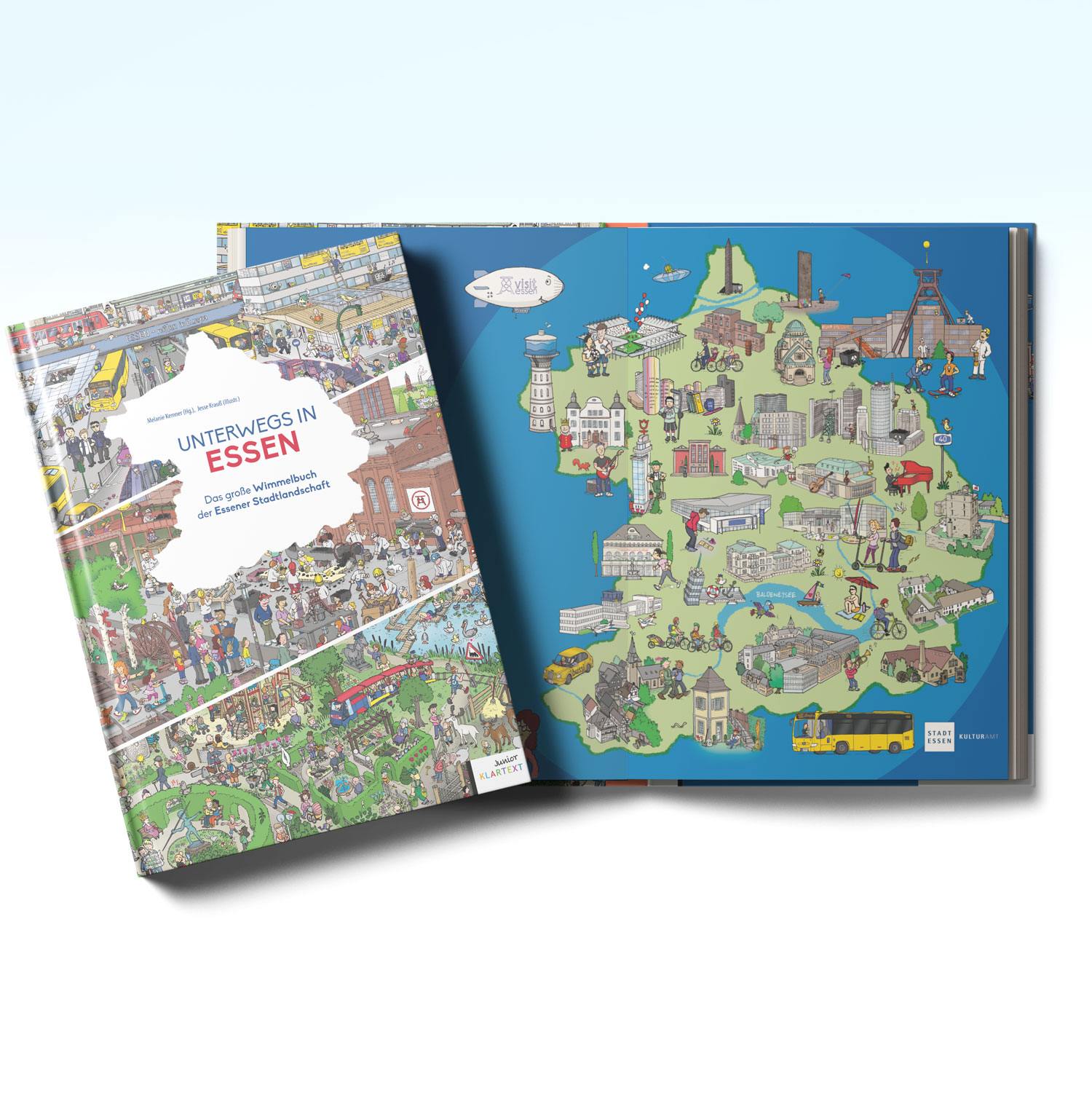 Melanie Kemner und Jesse Krauß rücken Ereignisse, Orte und Szenen des Essener Stadtlebens fantasievoll und detailreich ins Rampenlicht und schaffen ein Wimmelbuch für die ganze Familie.